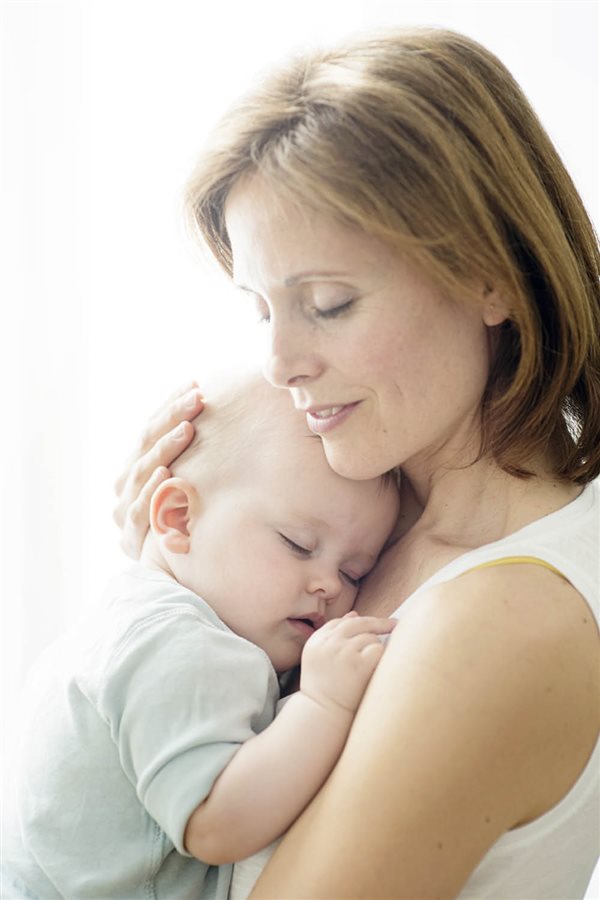 Toma a tu bebé y colócalo de frente a tu pecho. Con una mano sujétalo de la cabeza y con otra de sus pompitas. Su orejita debe quedar pegada a ti, para que pueda escuchar tu corazón. Comienza a moverte suavemente de un lado a otro.